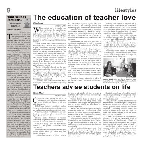 Lifestyles Editor hen couples move in together and finally tie the knot, they expect to spend a lot of time with each other. Their usual daily routines intertwine and they figure out how to live their lives as husband and wife, but while most couples work separate jobs, there are the few that get to be together every step of the day, namely teachers. Lauren and Brett Hamilton met through mutual friends after they both were already working at Hagerty. The two hit it off and got married a few years later. Since Lauren’s father was an English teacher like she was, and her mother was a PE coach like Brett, their marriage was meant to be. Even though they work together, the Hamilton’s have different morning and afternoon schedules. “We take separate cars to and from school because I take Baylor to his babysitter in the morning,” Brett said. “She likes to get to school as early as humanly possible.” The two of them have learned over the years how to maintain a healthy work relationship. They fight like normal couples but are professional enough to never bring it out during school hours. “Working together has strengthened our relationship. We always run ideas off of each other for inspiration,” Lauren said. Around the same time the Hamiltons started teaching, the Malkoviches joined the Husky family
