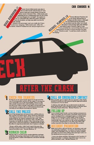 ne second, senior Mikey Reyenga was found it difficult to get back behind the wheel after the influence or following another car too closely. cruising down SR 434, eyeing the light for being in a car crash. “Both of my accidents happened because I the upcoming intersection. The next, he “I got in an accident the first day I had my rear-ended the car in front of me,” senior Olivia watched as a crash broke out a little further down license more than a month ago and I’m still scared Hawkins said. “I wasn’t really paying attention and on the road, leaving Reyenga with no other option to drive today,” Stephens said. “I was rear-ended at I regret it.” full speed because the guy [who] According to the than to slam into the accident unfolding before him. hit me was texting.” Florida Highway “You immediately freak out. You think ‘this “If you’re in a situation and Texting and driving has Patrol, the biggest wasn’t supposed to happen’ because you were just been a major cause of accidents, you don’t know what to do, causes for most teen jamming out to your favorite song and now you’re especially for younger drivers, it’s really scary. Someone’s driving accidents ruining your day and the days of the people around and accounted for nearly 25 include: failure to you,” Reyenga said. “It’s terrifying.” life could be on the line” wear a seatbelt, percent of crashes across the In Central Florida, teen drivers from local high country in 2013. Studies by inexperience, driving schools and UCF make up for a disproportionate - Olivia Hawkins, 12 National Highway Transportation drowsy, distracted or number of accidents in the area. In the United States, teens only make up 14 percent of the Safety Administration indicate that texting while drunk, the presence of other teenage passengers and population, yet they account for nearly 30 percent driving increases the likelihood of an accident 23 driving recklessly. of all car accidents. times over and is six times more likely to cause “It’s pretty simple: don’t be stupid,” Reyenga After the accident, Reyenga called 911 and an accident than being intoxicated. Contrary to said. “Safe driving is common sense.” watched as four more accidents took place as a popular belief, the majority of crashes occur in Measures to reduce teen driving accidents result of the crash he witnessed, backing up traffic daylight (66 percent), on a dry surface (84 percent), include more education and an increased focus for miles and causing a sense of frenzy. and in clear weather conditions (74 percent) while on accumulating experience behind the wheel. Reyenga and Stephens added that offering towing “Obviously the driver is distracted by a phone, services for teens to get home safely and further when you get in GPS, sound station or other “You immediately freak emphasis of the consequences of poor driving will a crash there’s a electronic device (42 percent). out. You think ‘this wasn’t help decrease car crashes for teenagers. lot of adrenaline “I used to check my phone “I don’t think people understand the power every once in a while, but you immediately supposed to happen.’ It’s and responsibility of driving,” Stephens said. have to put your phone away or in flowing through terrifying.” “Accidents are really scary and they can happen to your body,” the passenger seat because it’s just anyone. Nobody is invincible.” Reyenga said. “You never worth it,” Stephens said. - Mikey Reyenga, 12 Hawkins said taking her car for granted and have to remember to Teenagers are three times remain calm, don’t say anything incriminating. Call more likely to be in an accident than someone over not taking driving seriously caused her accident. the police and let them handle it.” the age of 20 and have the lowest reported seatbelt She said the increased awareness following her Although Reyenga has walked away unscathed use, with nearly half of all teens killed in crashes accidents will help prevent more in the future. from two separate accidents, he says they never last year failing to wear a seatbelt. Teenagers are “It’s not a game,” Hawkins said. If you’re in a become less terrifying. also more likely to take risks and underestimate the situation and you don’t know what to do, it’s really Junior Hannah Stephens, like Reyenga, also danger of a perilous situation, such as driving under scary. Someone’s life could be on the line.”