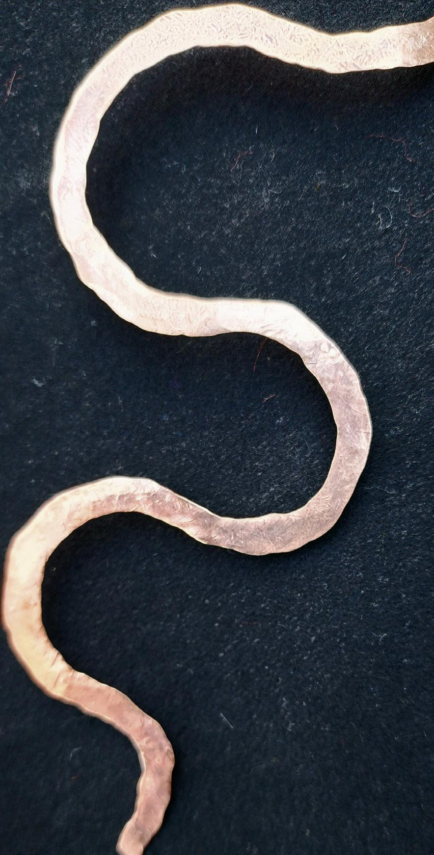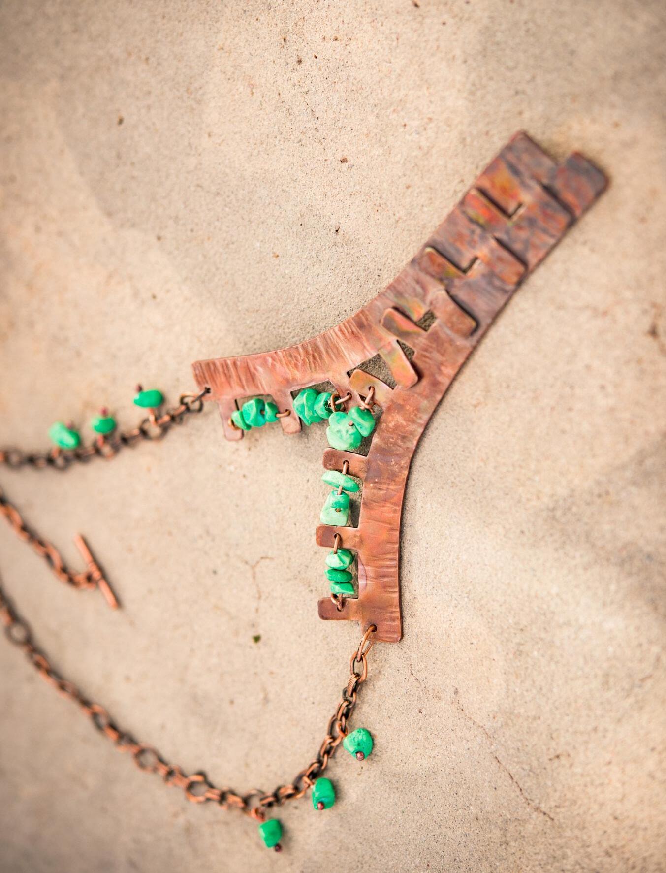 This rustic piece of wearable art represents opening up a new future, by unzipping items from the past. It was created from salvaged scrap copper, combined with wire, chain and turquoise chips.