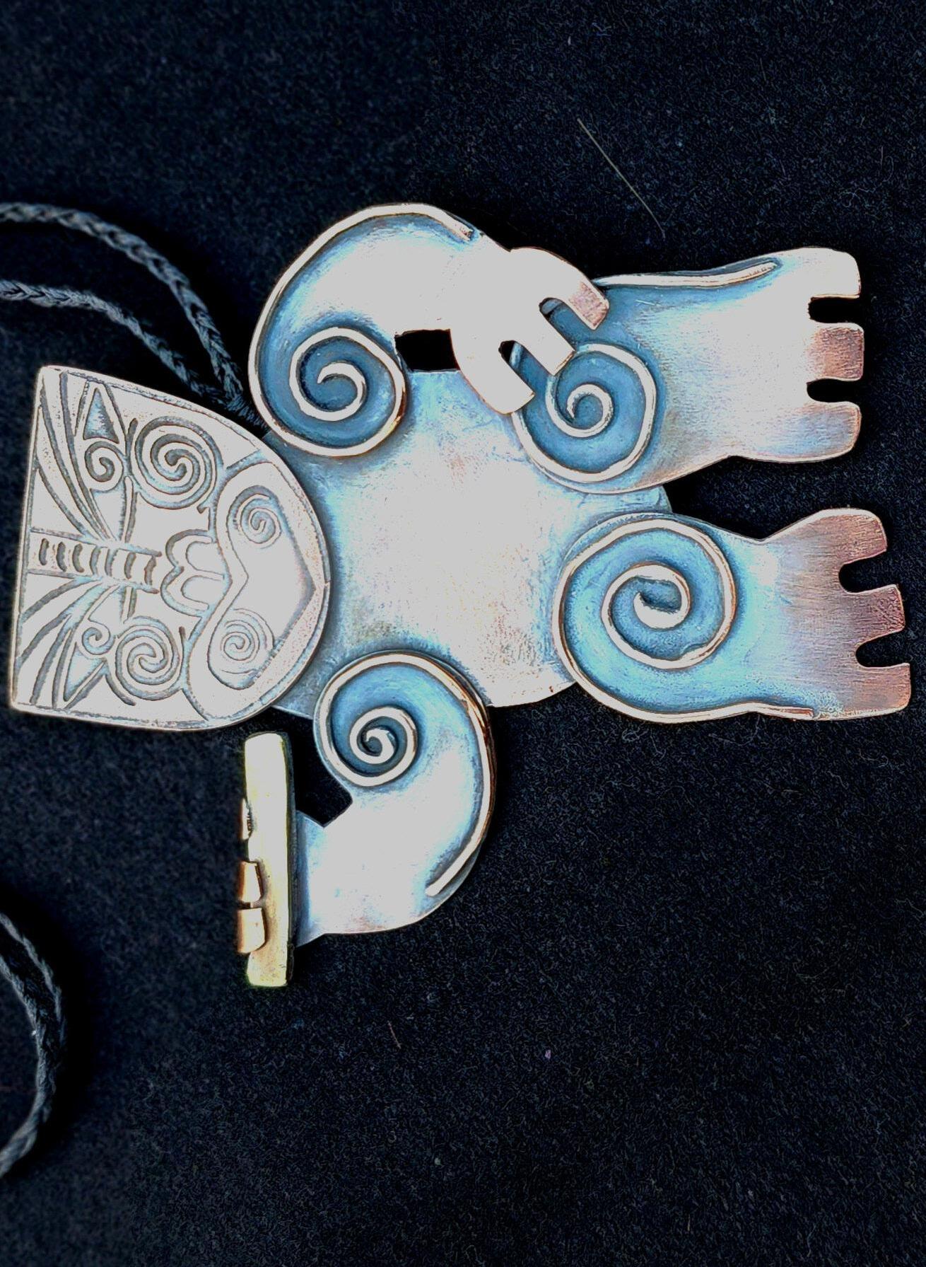 He uri tēnei nō Ngāti Apa. I wanted to create something personal that ties me with my Māori culture. My piece is inspired by illustrations from Māori children’s books I grew up with that taught me about Māori myths and legends. This piece represents Tūmatauenga the god of war and mankind. this is made of copper and the patu is made of brass.