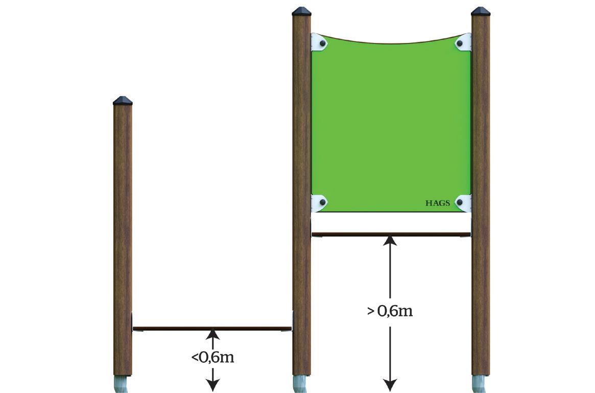Vid fallhöjd lägre än 0.60 m och utan “tvingande rörelse” då krävs inte stötdämpande ytbeläggning. (HAGS rekommenderar dock alltid minst en gräsyta)