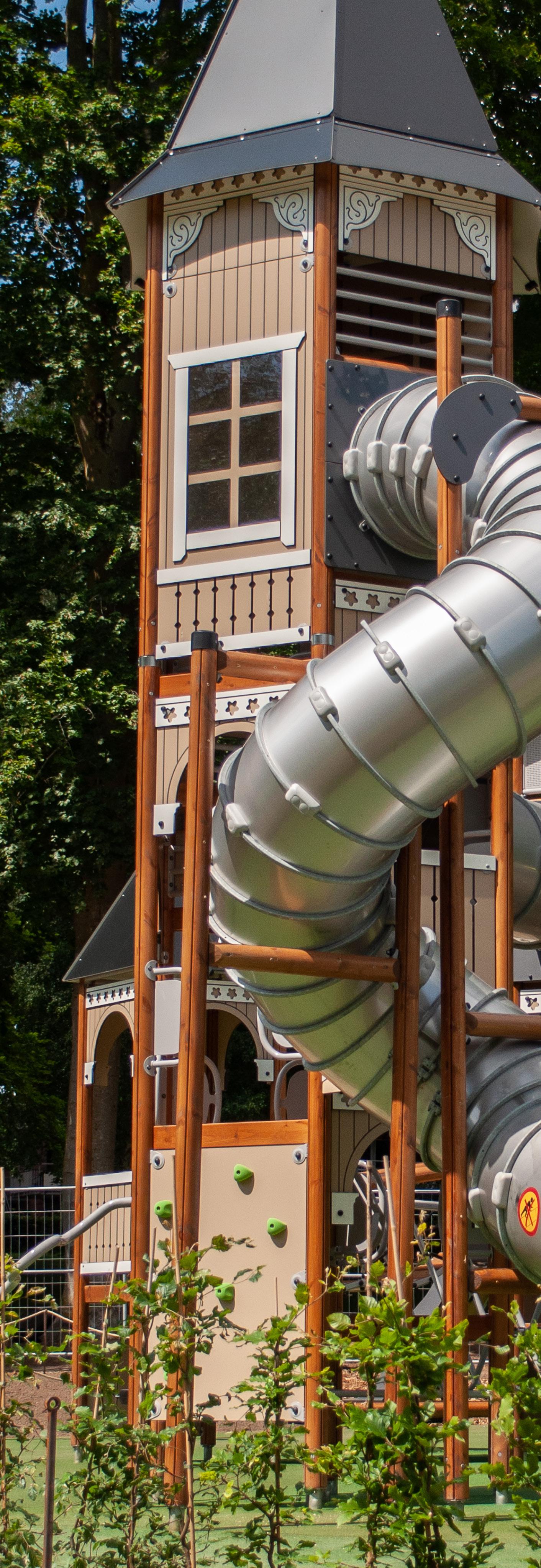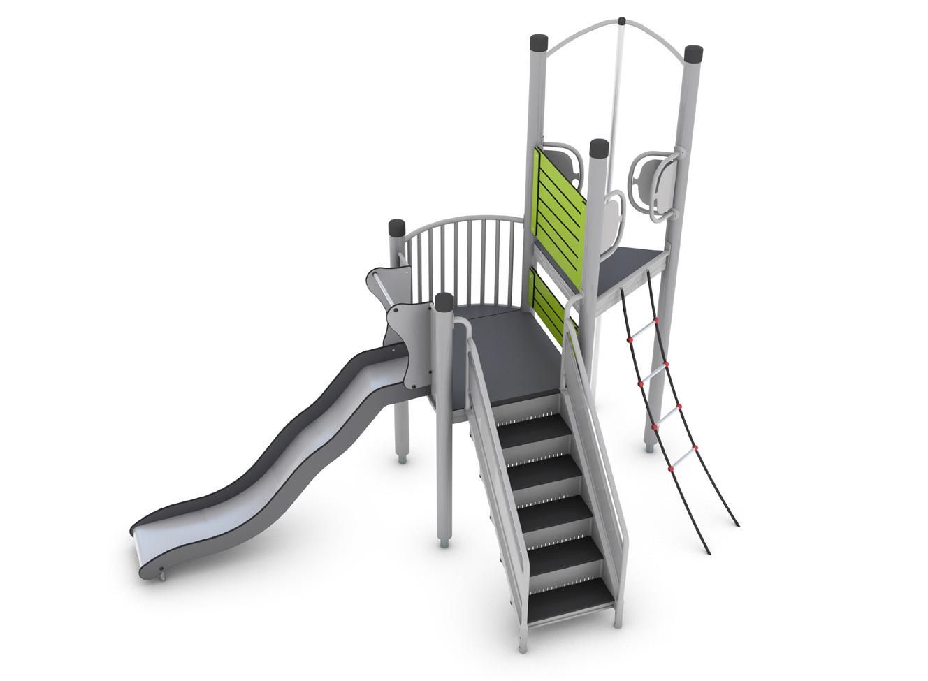 Le Byrmax est une tour simple mais divertissante. Le mur d'escalade exige de l'équilibre et de la coordination, comme une expérience d'escalade en montagne, et crée un sentiment de défi ! Les enfants peuvent ensuite s'échapper par le toboggan en acier classique mais contemporain.