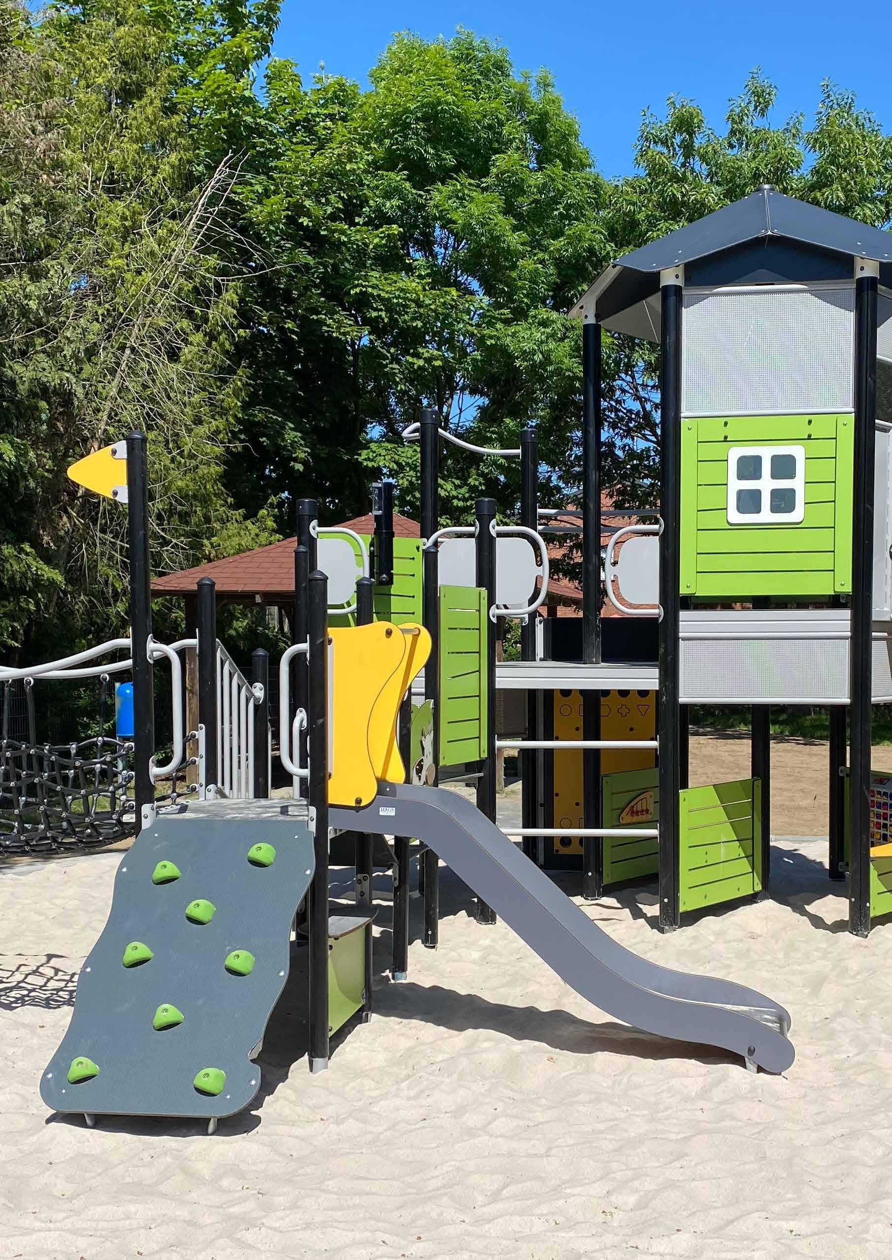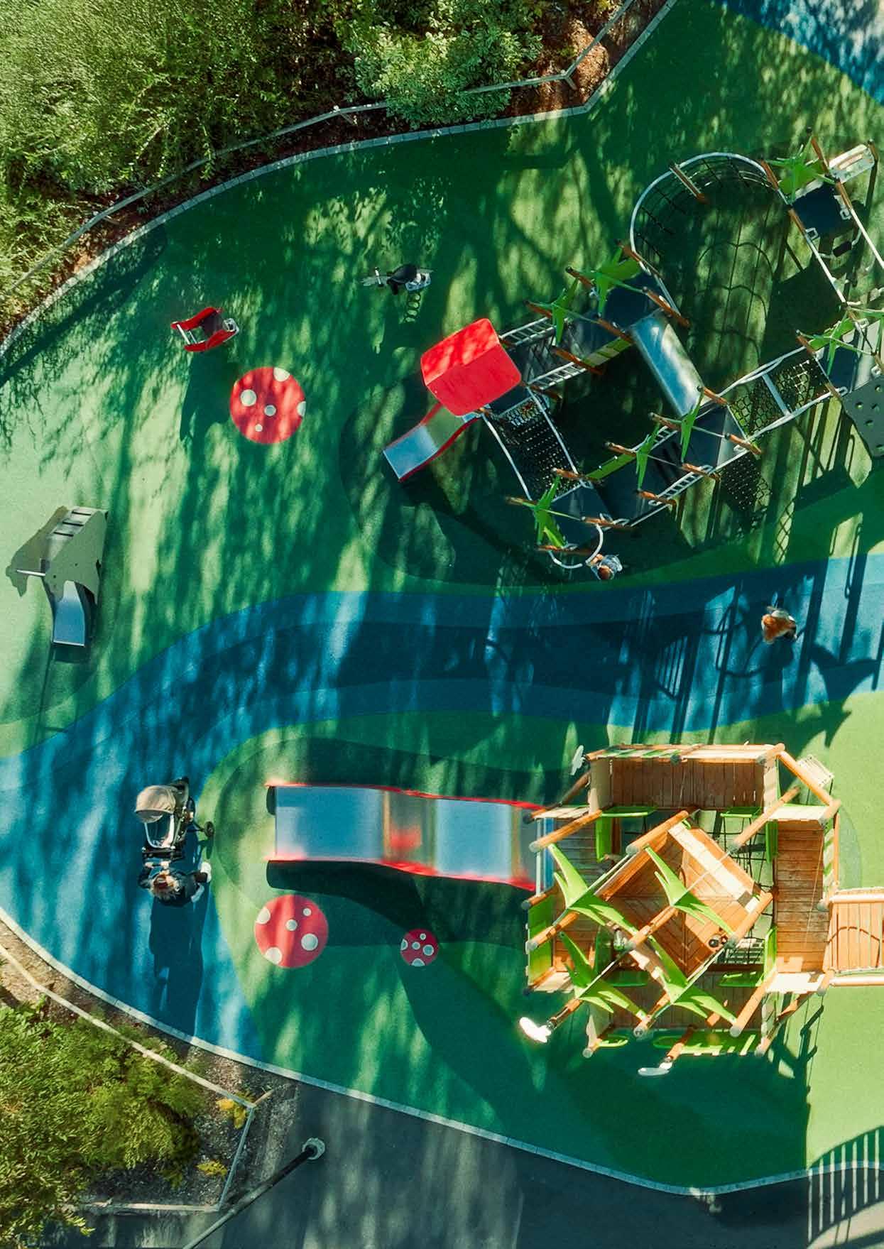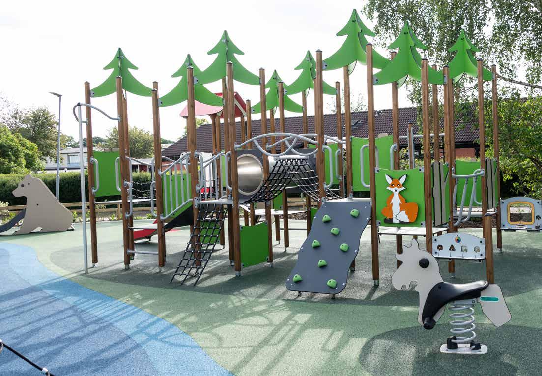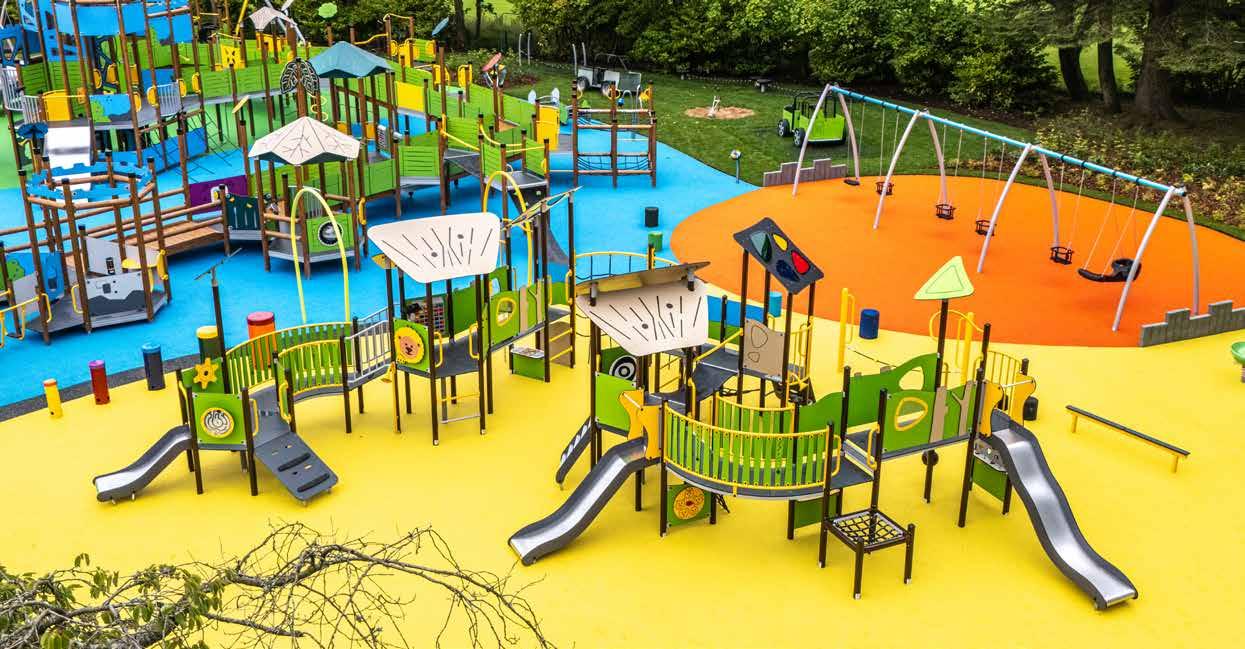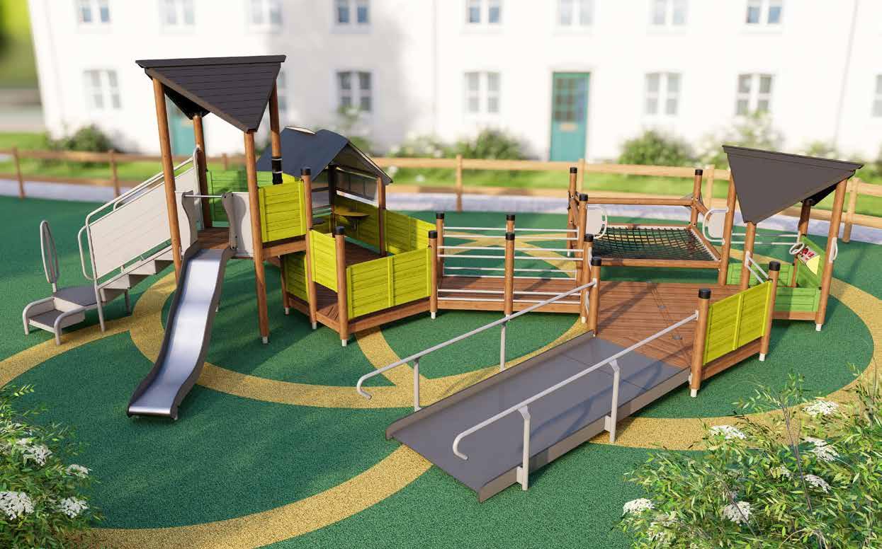 The play area features engaging structures and equipment for children of all ages and abilities, creating an inclusive space where everyone can explore and enjoy time together.