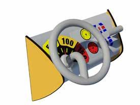 This play panel mimics a car dashboard with a steering wheel and a gear shift.