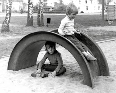 Billedet siger mere end ord! I 1960'erne blev børnenes glæde illustreret med blyant, nu er det i stedet fanget på billeder. Alligevel er der nøjagtig det samme udtryk i deres ansigter. Materialer, teknologi, design og sikkerhedstænkning er i konstant udvikling, men lysten til at lege er og