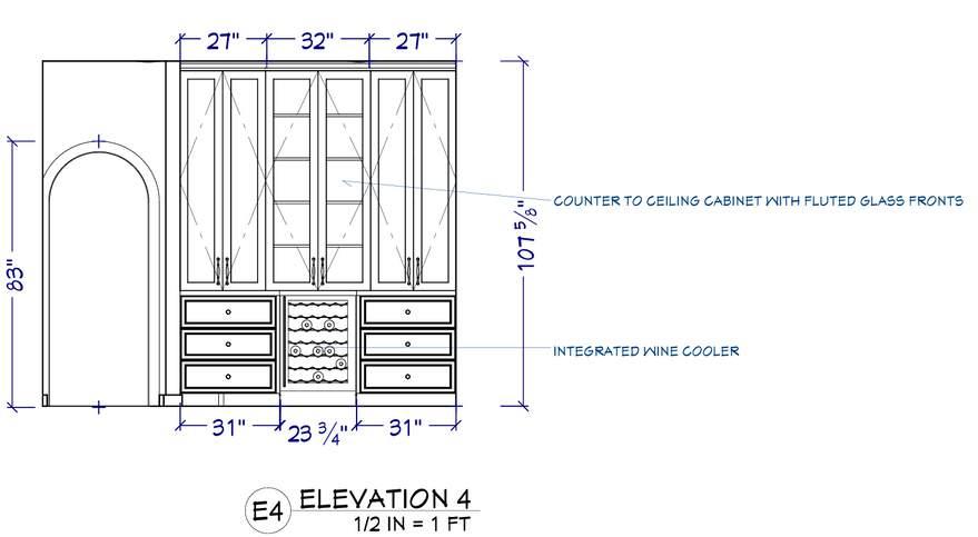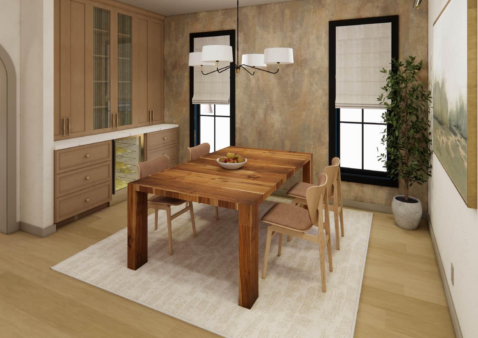 The hutch wall was a must-keep piece for the client, so we relocated it to the dining room to better suit the space. Featuring both upper and lower cabinets, it provides ample storage while integrating a small wine cooler in the lower section for added convenience The top middle portion showcases glass doors, allowing the client to elegantly display fine china or decorative pieces, blending both functionality and style.