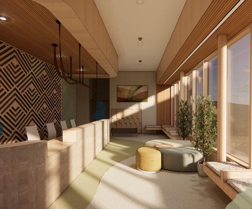 Every aspect of this project, down to the material selections, is designed to reflect the region’s natural beauty The two materials showcased above embody the essence of the landscape one mirroring the distinctive lines of aspen tree trunks, while the other represents the diverse peaks of the surrounding mountains. Natural elements, such as skylights inspired by the branching patterns of aspens, bring in abundant daylight to promote healing and reinforce the theme of interconnectedness.