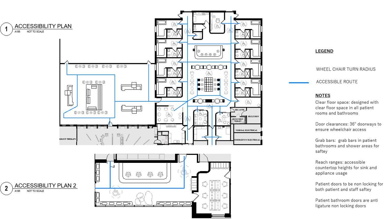 Thoughtfully designed spaces cater to diverse needs, offering open communal areas for connection and private rooms for solitude and reflection A color-coded wayfinding system enhances navigation, reducing anxiety for patients and visitors. Safety and comfort are prioritized through features like secure patient storage, non-locking anti-ligature doors, and a carefully monitored nourishment center.