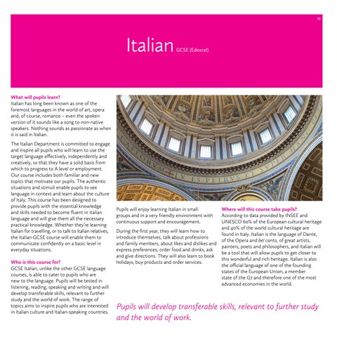 Where will this course take pupils? According to data provided by INSEE and UNESCO 60% of the European cultural heritage and 40% of the world cultural heritage are During the first year, they will learn how to found in Italy. Italian is the language of Dante, introduce themselves, talk about professions of the Opera and bel canto, of great artists, and family members, about likes and dislikes and painters, poets and philosophers, and Italian will express preferences, order food and drinks, ask be a tool that will allow pupils to get closer to and give directions. They will also learn to book this wonderful and rich heritage. Italian is also holidays, buy products and order services. the official language of one of the founding states of the European Union, a member state of the G7 and therefore one of the most advanced economies in the world. Pupils will enjoy learning Italian in small groups and in a very friendly environment with continuous support and encouragement.