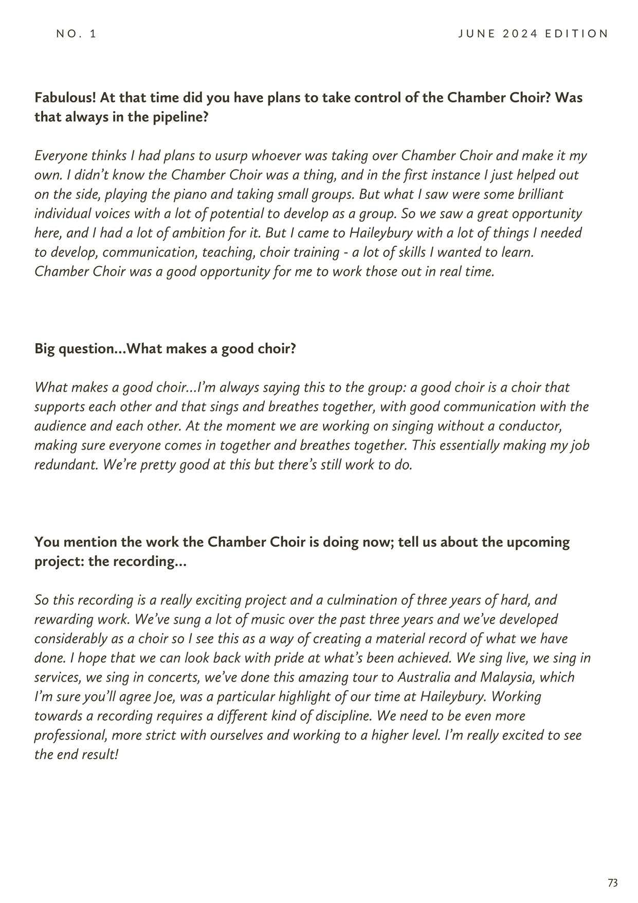He assumed the role just before Covid and is responsible for the remarkable recovery of the department, returning it to its former glory, from its hibernation. Many believe it has never been stronger, with the Master commenting: 'It is a very well functioning department!' I met with the Master to discuss Mr Bland and his legacy at Haileybury, and we spoke of how Mr Bland had inherited the department just before the extraordinary events of the Covid-19 pandemic, when he was 'putting building blocks in place'. It was his leadership which kept music as a central aspect of cultural life at school. He embraced technology in ways that no other head of department would have thought to have done, organising Haileybury's first live broadcasted concerts, emphasising community through social media, and promoting the study of music technology with Mr Royall. We spoke of how on our return to campus, Chapel, a universally adored aspect of Haileybury life, was vastly diminished as result of masks and Covid restrictions. Mr Bland and his glorious fanfare of "Good Morning my Friends!,, in Congers not only resurrected Chapel's unanimous appeal but have become an inseparable part of its identity in the eyes of many. Mr Bland has made Chapel for everyone. 'Congers' on a Friday is something that everyone looks forward to. By extension, he has made music for everyone. Popular music radically transformed during his reign since the Jazz and Pop Gala became an annual institution. He has championed pupil voice and initiative, like no other head of department with pupil-led ensembles making their debuts at awe-inspiring concerts. The Master noted the brilliance of Mr Bland sculpting a department with so many genres and sections, making the music department so much more diverse than it has ever been with music being available to pupils in a far 'broader sense'.