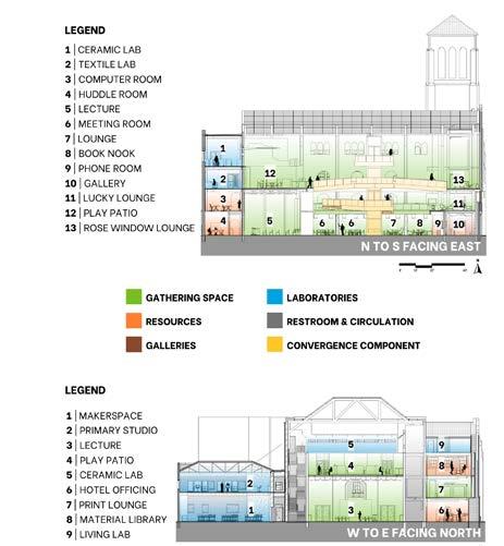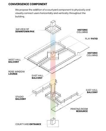 Our design concept, aptly named “Convergence,” serves as the guiding principle for our project. We envision a space where Arizona State University students, design professionals, the essence of the Arizona desert, and the vibrant energy of downtown Phoenix converge harmoniously within this building. Furthermore, we have seamlessly integrated the historic elements of the structure with the contemporary updates necessary to meet the demands of the design school. This blending of the old and the new not only preserves the building’s heritage but also enhances its functionality for present and future generations of creatives.