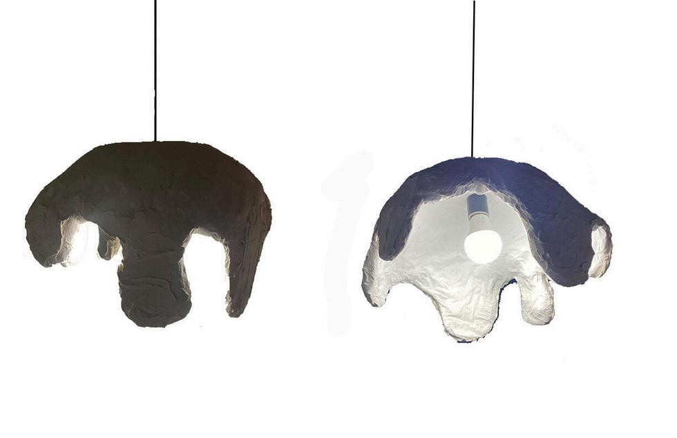This pendant light is inspired by architect Zaha Hadid. She is known for her curvilinear forms. She often uses concrete, glass, and steel. I loved the “drooping” aspect of the building below and took inspiration from that.