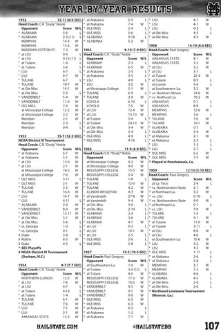 YEAR-BY-YEAR RESULTS 1952 12-11 (6-9 SEC) Head Coach: C.R. “Dudy” Noble Opponent Score W/L * ALABAMA 5-6 L * ALABAMA 2-3 (11) L MEMPHIS 14-3 W MEMPHIS 13-6 W MERIDIAN COTTON ST. 7-2 W * at LSU 0-4 L * at LSU 9-10 (11) L * at Tulane 1-4 L * at Tulane 5-6 L * LSU 6-7 L * LSU 8-7 W * TULANE 6-7 L * TULANE 18-7 W * at Ole Miss 14-1 W * at Ole Miss 5-9 L * VANDERBILT 5-4 W * VANDERBILT 11-4 W * OLE MISS 7-0 W at Mississippi College 12-2 W at Mississippi College 3-2 W Meridian 2-1 W Meridian 2-3 L Meridian 0-4 L