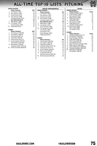 ALL-TIME TOP-10 LISTS: PITCHING SINGLE SEASON Player (Season) APP 1. Jon Harden (1992) 39 2. Van Johnson (1997) 39 3. Chad Girodo (2013) 36 4. Van Johnson (1998) 34 Jonathan Holder (2013) 34 Ross Mitchell (2013) 34 7. Mike Martin (1988) 33 8. Jon Harden (1991) 32 Scott Tanksley (1994) 32 10. Caleb Reed (2012) 31 CAREER Player (Seasons) APP 1. Van Johnson (1995-98) 115 2. Jon Harden (1989-92) 110 3. Caleb Reed (2009-12) 96 4. Scott Polk (1995-99) 90 5. Chad Girodo (2010-13) 83 6. Scott Tanksley (1993-95) 82 Trent Intorcia (1983-86) 82 8. Mike Martin (1986-88) 81 Jonathan Holder (2012-14) 81 10. Chad Crosswhite (2006-09) 80