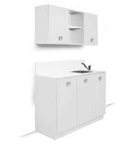 Puesto de trabajo con repisa de acero inoxidable. Estructura de pvc con acabado latón o negro brillante. Sin reposapiés.