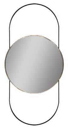 Styling unit with round mirror edged in gold, attached to matt black steel oval frame. Optional matt black shelf to fit directly to wall available on request.