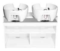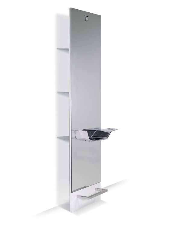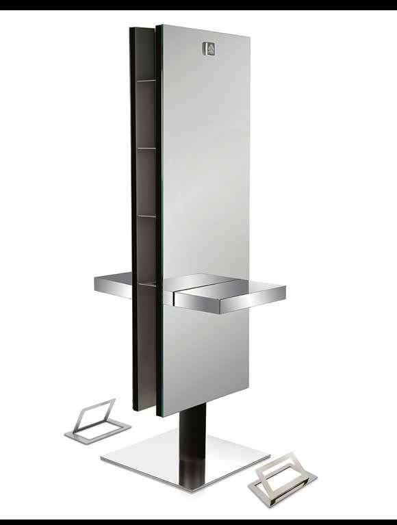 2 position island styling unit with mirror frame in vinyl resin with gloss gold or black finish, and polished stainless steel shelf and metal base. Equipped with 4 integrated sockets. Footrests not included.