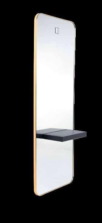 Posto di lavoro con specchio bordato in pvc color oro lucido, fissato ad una struttura ovale in metallo nero opaco. Disponibile su richiesta una mensola nera opaca da fissare direttamente a parete.