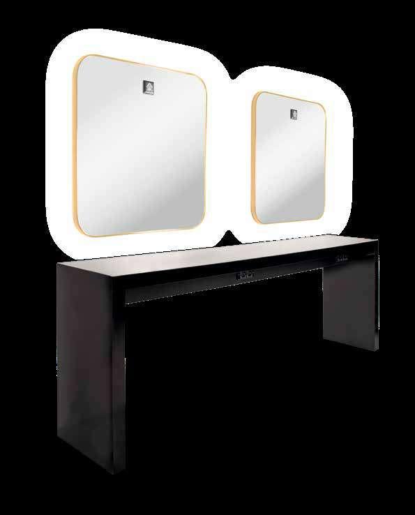 2 seater wall styling unit in black gloss laminate (Noir Luxe T15) with 4 integrated sockets. Square mirror with pvc frame in gloss gold or gloss black finish Tocador 2 puestos en estratificado Noir Luxe T15. 4 tomas integradas. Tocadore en forma cuadrada con marco de pvc en acabado oro brillo o negro brillo. Wand-Frisiertisch 2 Plätze. Laminat schwarz glänzend (Noir Lux T15) 4 integrierten Steckdosen. Spiegel in quadratischer Form mit PVC-Rahmen in glänzendem Gold oder glänzendem Schwarz.