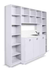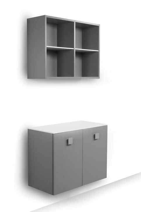 Isola 4 posti con vano contenitore composto da 2 cassetti Il piano di lavoro e la struttura in metallo sono in nero opaco, il contenitore e il bordo specchio sono in nero lucido. Poggiapiedi integrato con protezione.