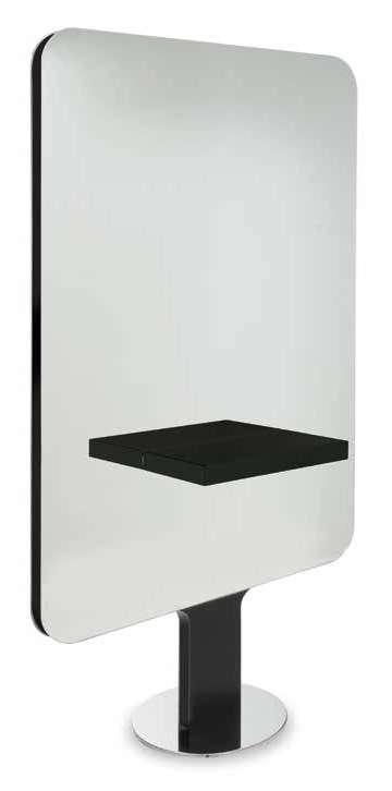 Posto di lavoro con specchio bordato in pvc nero lucido, fissato ad una struttura ovale in metallo nero opaco. Disponibile su richiesta una mensola nera opaca da fissare direttamente a parete.