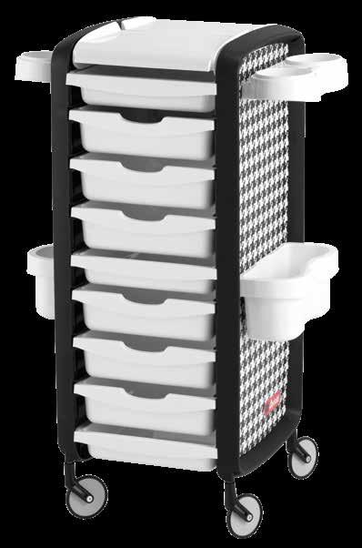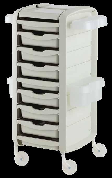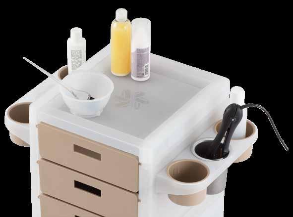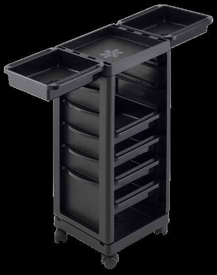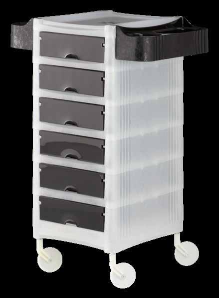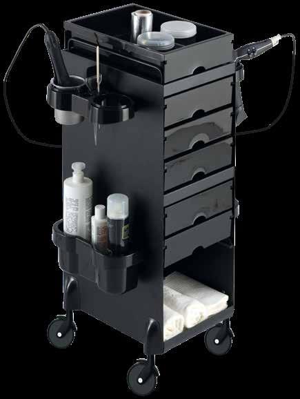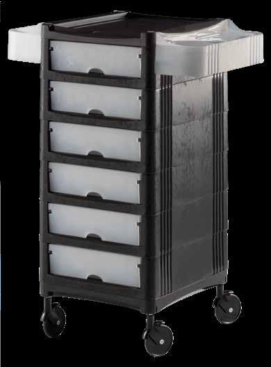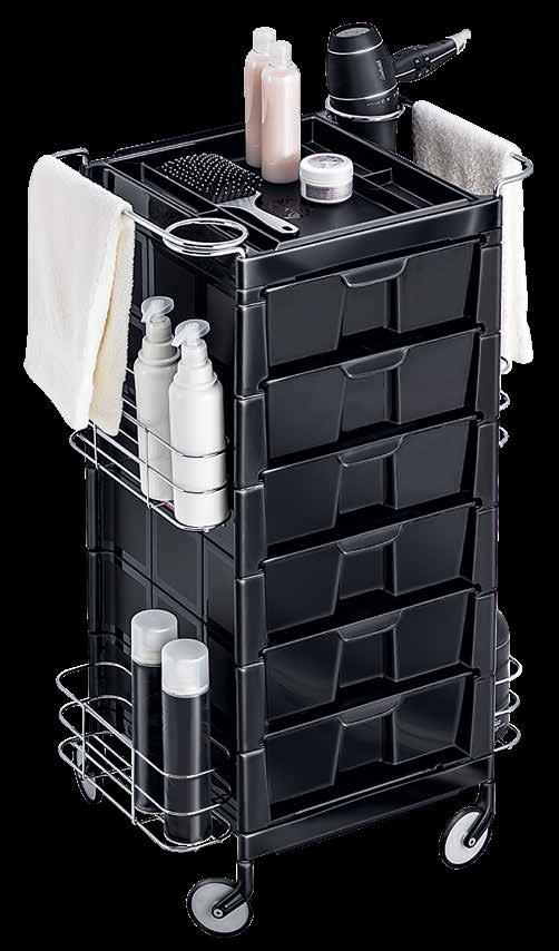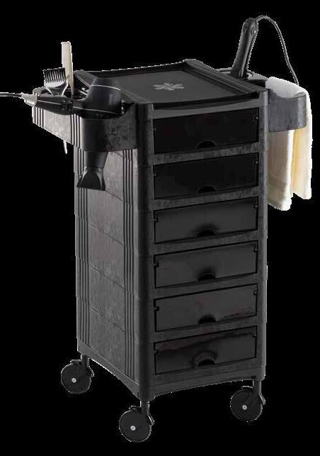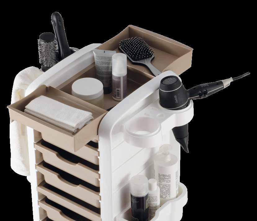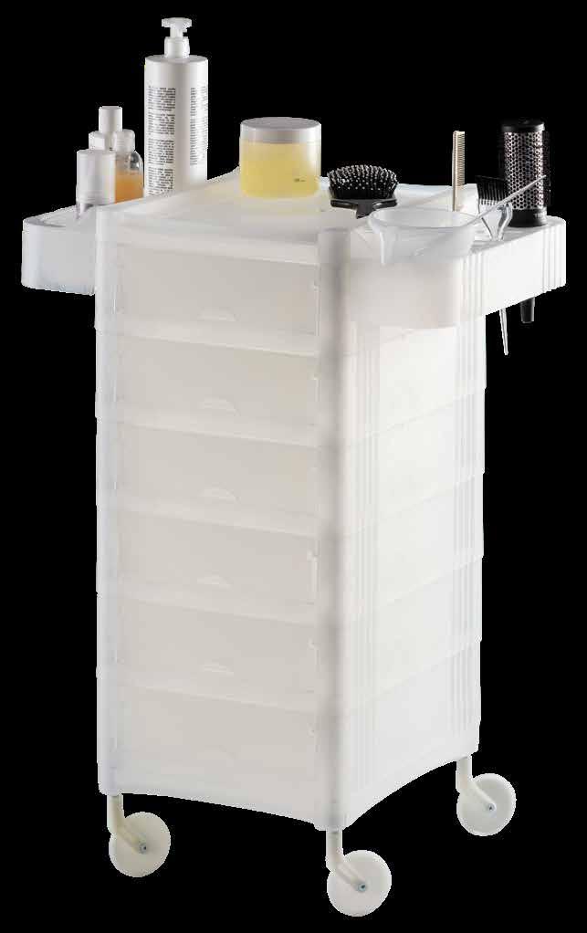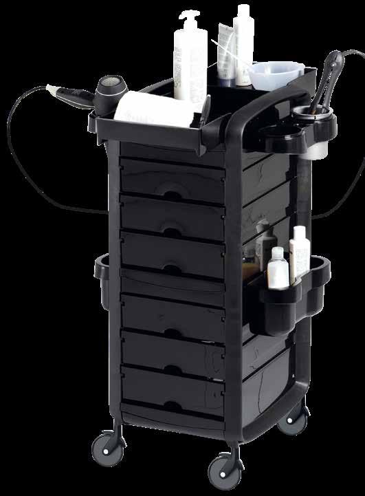 Trolley with 6 interchangeable drawers, available in different colours, all made of stain-resistant material. Equipped with trays that can be opened to create a functional worktop and exclusive “NoHair” wheels. Side supports included to place bottles, tanks, dryers and irons.