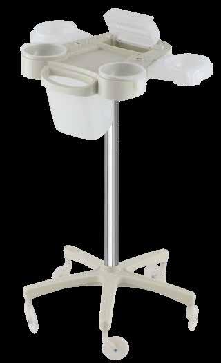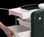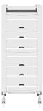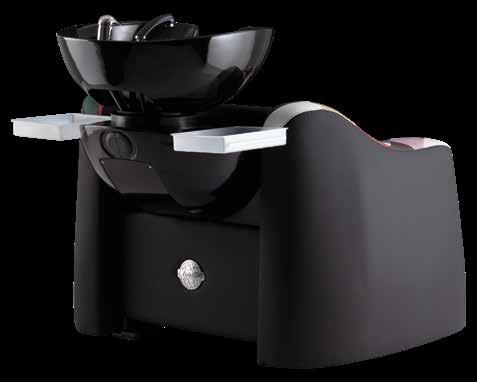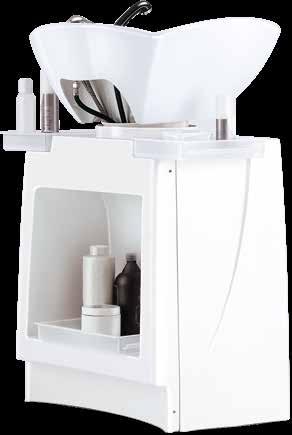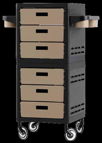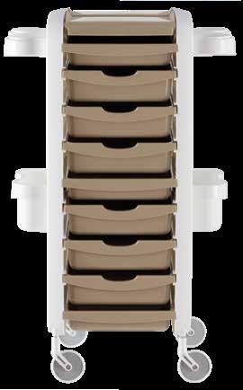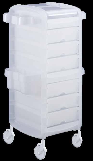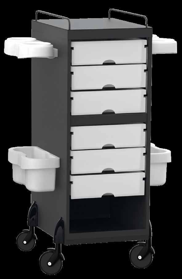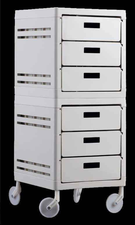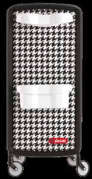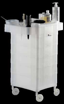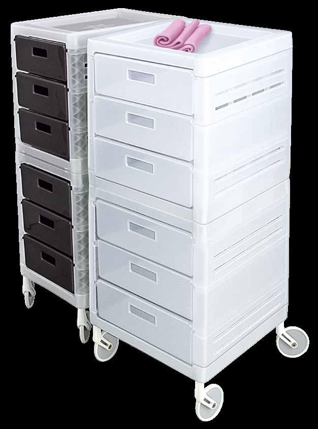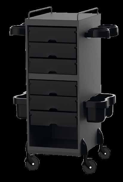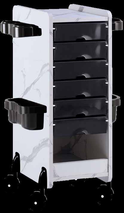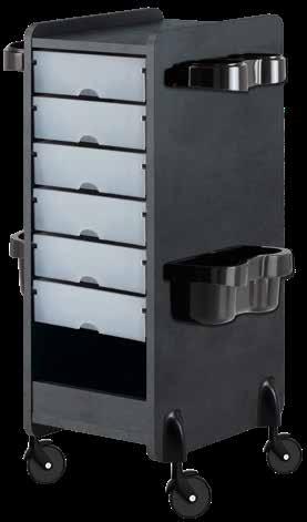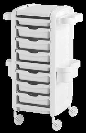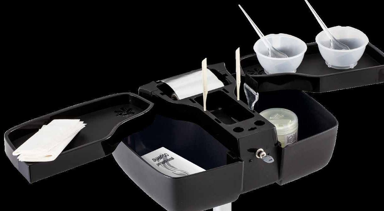 Trolley with 6 interchangeable drawers, available in different colours, all made of stain-resistant material. Equipped with trays that can be opened to create a functional worktop and exclusive “NoHair” wheels. Side supports included to place bottles, tanks, dryers and irons.