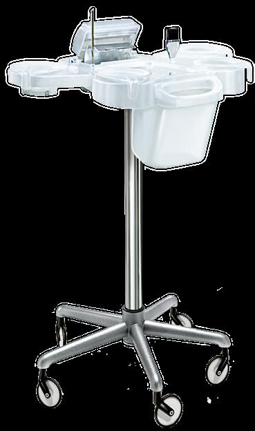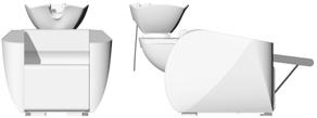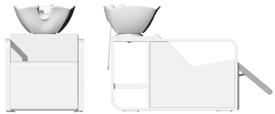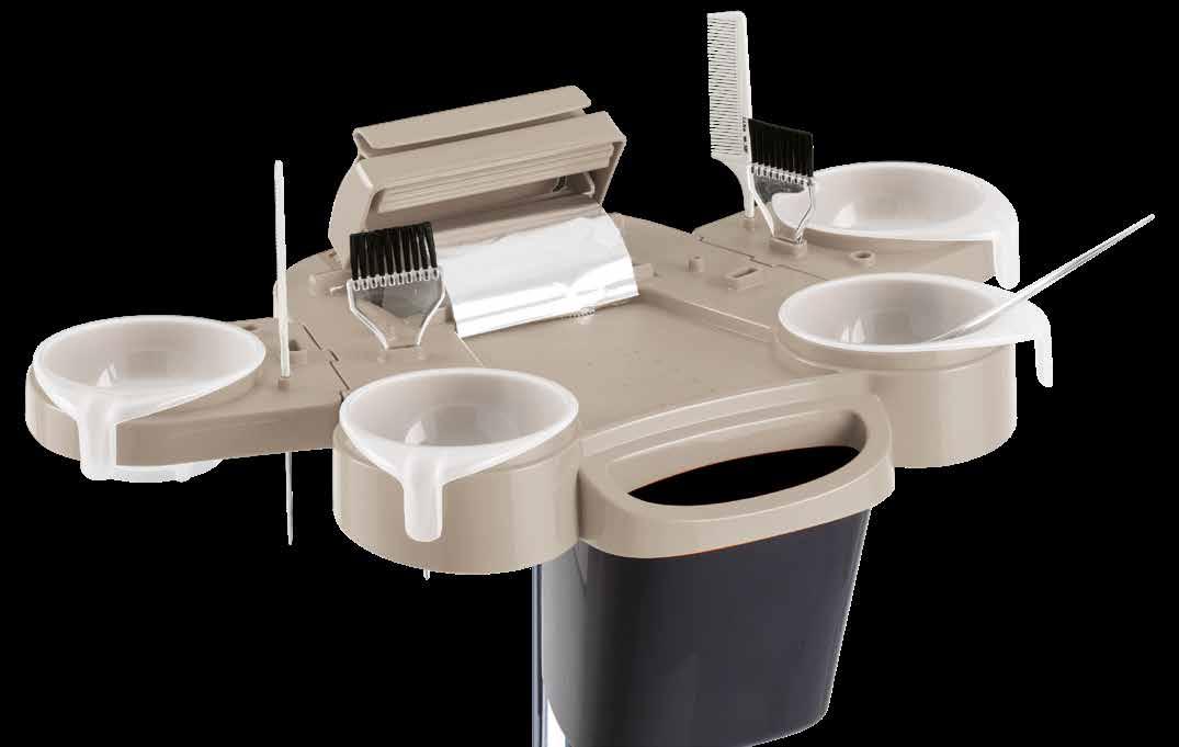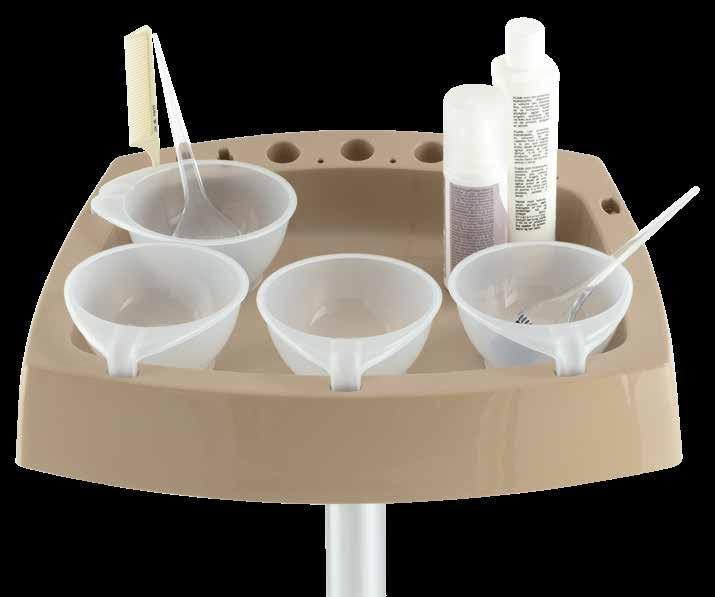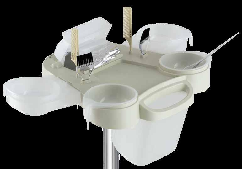 Colour station in color-resistant material with housings for combs and brushes. 5 color bowls included. Aluminium base available upon request.