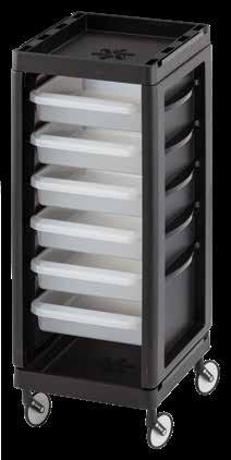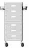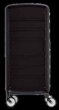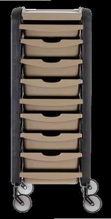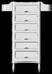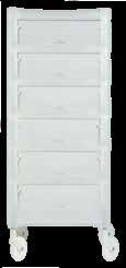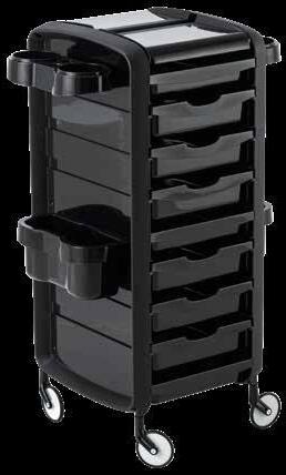 Carrello con 6 cassetti intercambiabili, disponibile in diversi colori, tutti in materiale anti-macchia. Dotato di sportelli superiori apribili a creare un piano di lavoro funzionale ed esclusive ruote “No-Hair” anti-capello. Inclusi supporti laterali per alloggiare bombole, flaconi, phon e piastre.