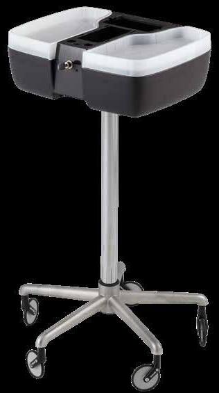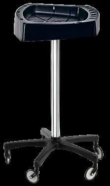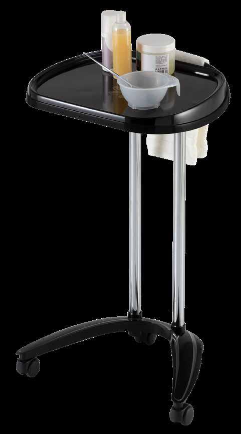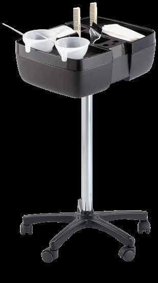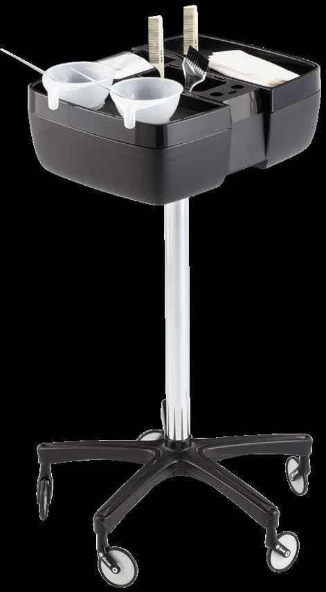 Carrello in materiale resistente al colore con alloggiamenti per pettini e spazzole. 5 ciotole per colore incluse. Disponibile anche con base in alluminio.