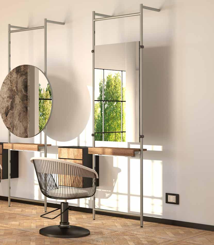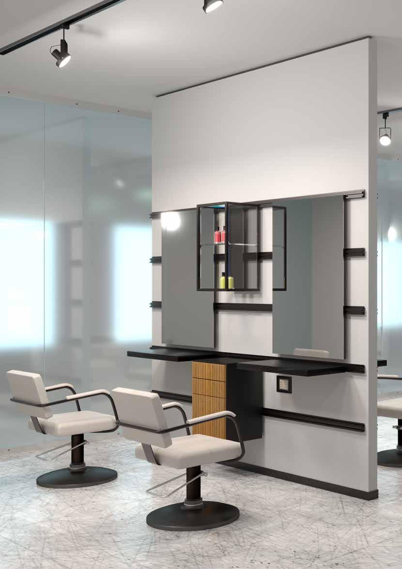 Wall Fix is a practical wall fixing system that allows the positioning of mirrors and accessories with a flexible and space-saving method. The furnishings can be placed, moved and repositioned according to the needs of the salon by exploiting the length of the practical rails, fixed to the wall.