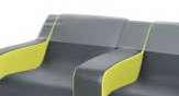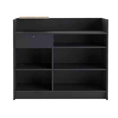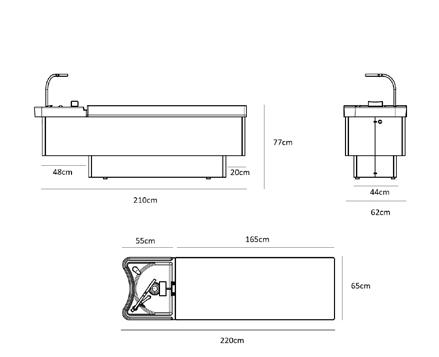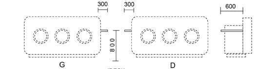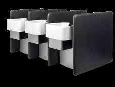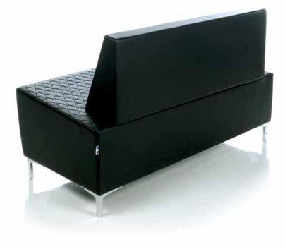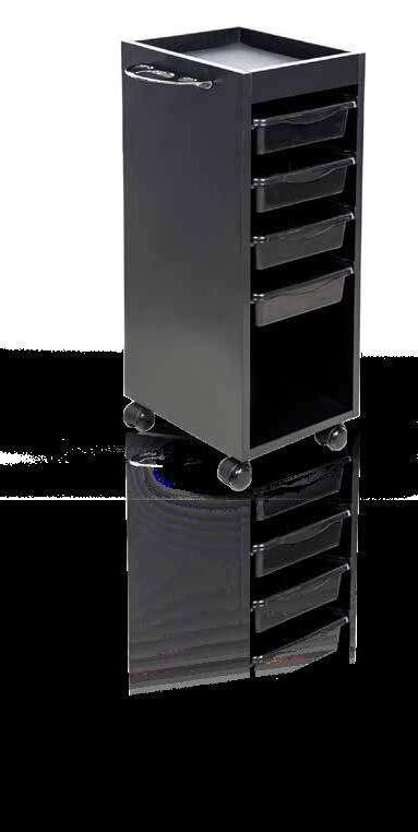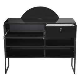 ■ Isola 4 posti con vano contenitore composto da 2 cassetti Il piano di lavoro e la struttura in metallo sono in nero opaco, il contenitore e il bordo specchio sono in nero lucido. Poggiapiedi integrato con protezione.