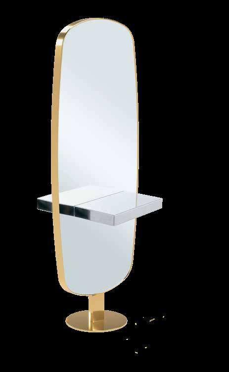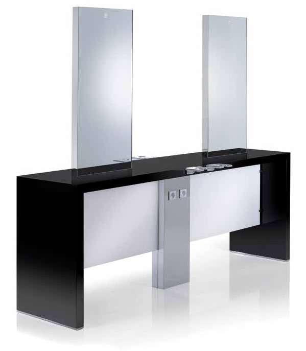 ■ 2 position island styling unit with mirror frame in vinyl resin with gloss gold or black finish, and polished stainless steel shelf and metal base. Equipped with 4 integrated sockets. Footrests not included.