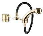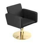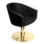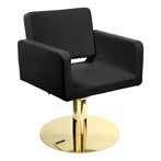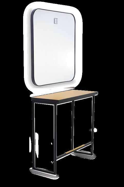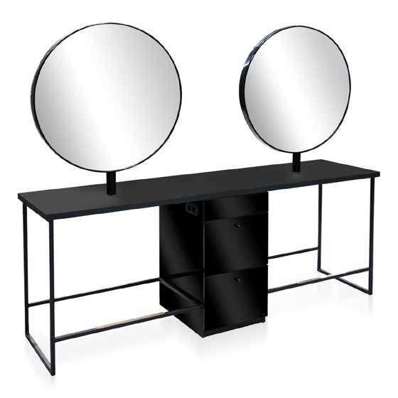 ■ Styling unit with black metal structure and laminate top in satin brass finish, matt black T42 or Montreal T10. Round mirror with gold or gloss black frame. Footrest included.