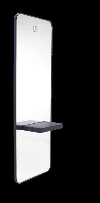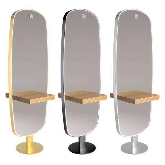■ Styling unit with round mirror edged in gloss black, gold or silver attached to matt black steel oval frame. Optional matt black shelf to fit directly to wall available on request.