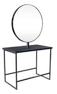 ■ Coiffeuse avec structure métallique noire et tablette en stratifié coloris laiton satiné. Miroir carré avec cadre en PVC or ou noire polie. Avec repose-pieds.