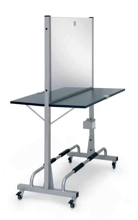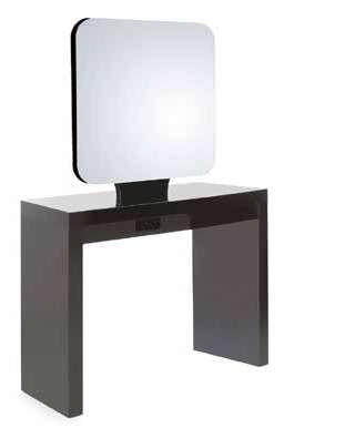 ■ Coiffeuse avec tablette en inox. Cadre PVC en laiton ou noir brillant. Sans repose-pieds.