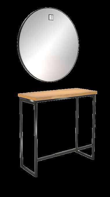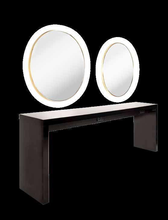■ Tocadores con estructura de metal negro Tapa laminada con acabado latón satinado, negro mate T42 Espejo redondo con marco dorado o negro brillo. Con reposapiés.