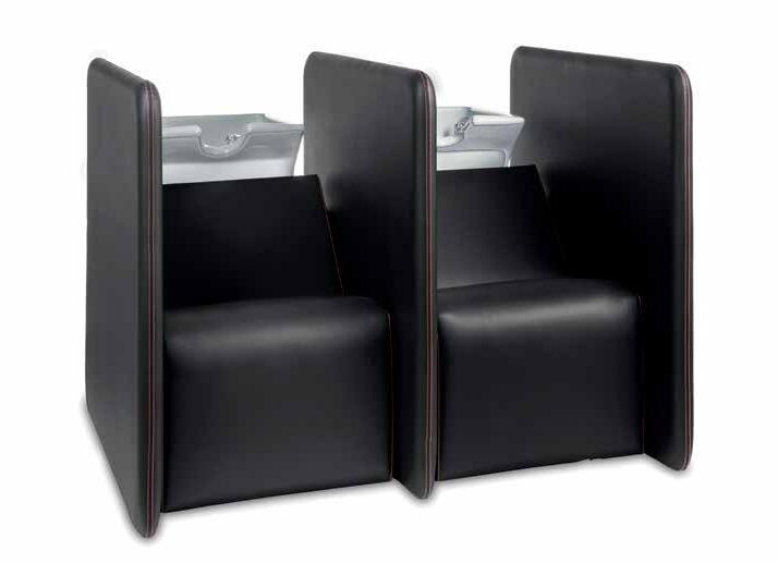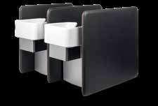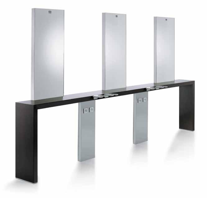 ■ Îlot 4 places avec rangement et 2 prises électriques par poste. Plateau et structure en acier en finition noir mat, meuble de rangement et profil du miroir en noir brillant. Repose-pieds intégrés avec protection en laiton.