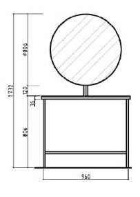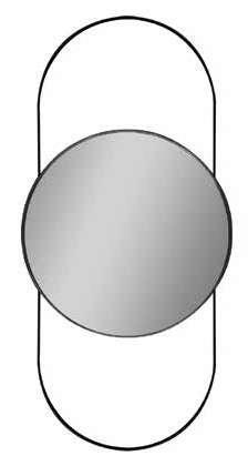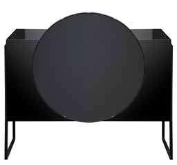 ■ Tocadore con espejo redondo bordeado en negro brillo, oro o plata fijado a una estructura ovalada en acero negro mate. Disponible bajo pedido un estante negro mate, para fijar directamente a la pared.