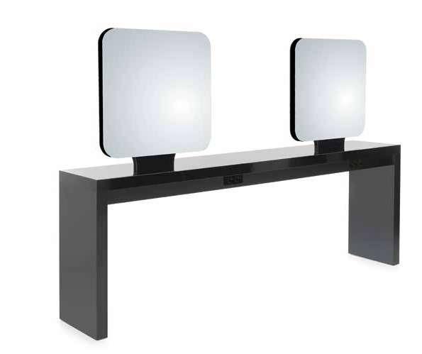 ■ Coiffeuse centrale 2 places avec cadre PVC en or ou noir brillant et tablette et base en inox, équipée de 4 prises électriques. Sans repose pieds.