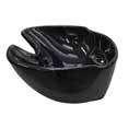 ■ Isla de 4 plazas con aparador y 2 tomas eléctricas por puesto. La encimera y la estructura de acero son de color negro mate, mientras que el contenedor y el borde del espejo son de color negro brillante. Reposapiés integrados con protección de latón.