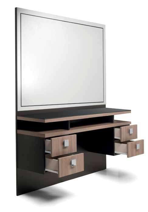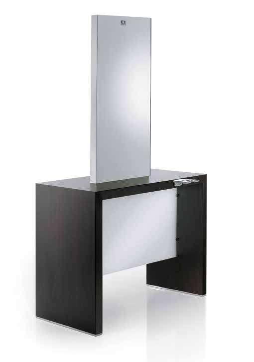 ■ Coiffeuse centrale 2 places avec cadre en or, noir brillant ou argent et insert à illumination LED. Tablette, en option, en finition inox ou Montréal. La base est teintée comme le cadre. Equipée de 4 prises électriques. Sans repose pieds.