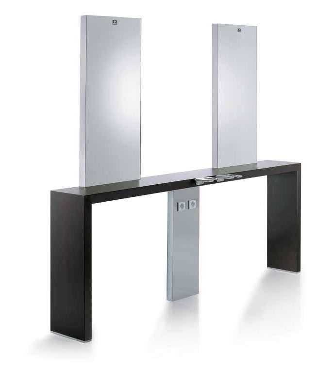 ■ Posto di lavoro centrale 2 posti con cornice in oro, nero lucido o argento e inserto a illuminazione LED. Mensola opzionale in acciaio inox o Montréal. Base tinta come la cornice. Dotata di 4 prese elettriche. Senza poggiapiedi.