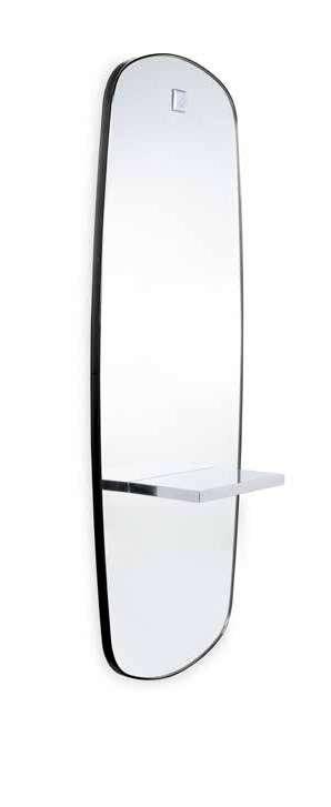 ■ Posto di lavoro con specchio tondo bordato nero lucido, oro o argento fissato ad una struttura ovale in acciaio nero opaco. Disponibile su richiesta una mensola nera opaca, da fissare direttamente a parete.