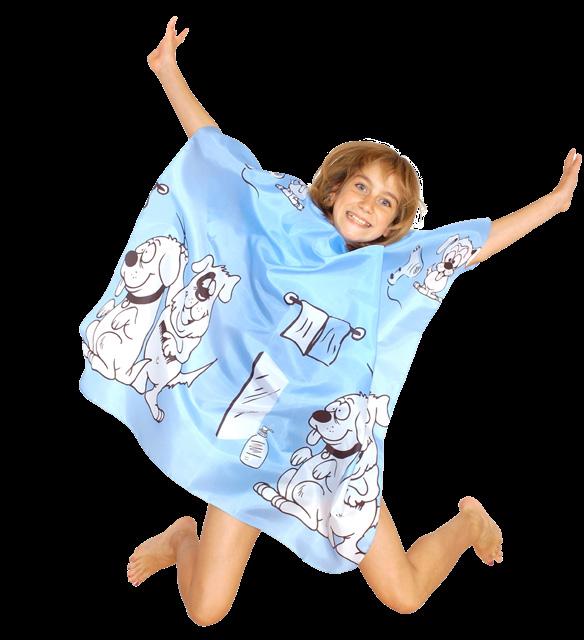 Children’s gown with carton doggy design. Made from a polyester fabric for durability. Water repellent. Features an adjustable cling fastening.