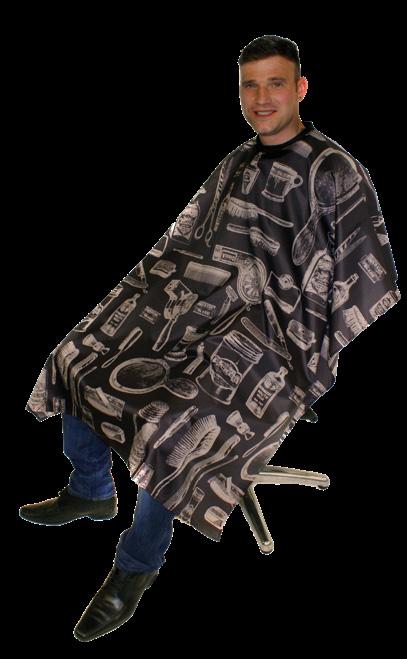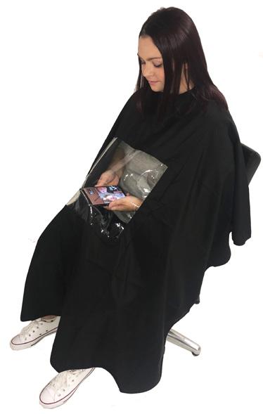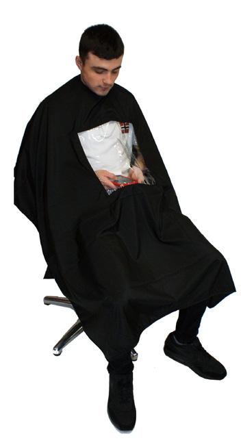 Stylish unisex cutting cape, featuring a PVC window which allows your client to use their phone. 100% polyester and static free. Water repellent. Press-stud.