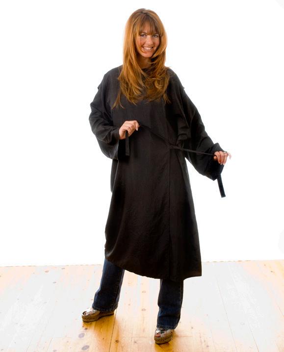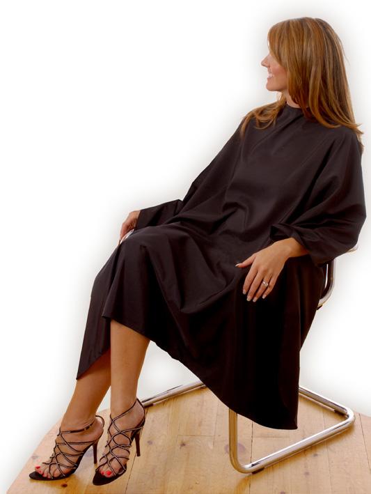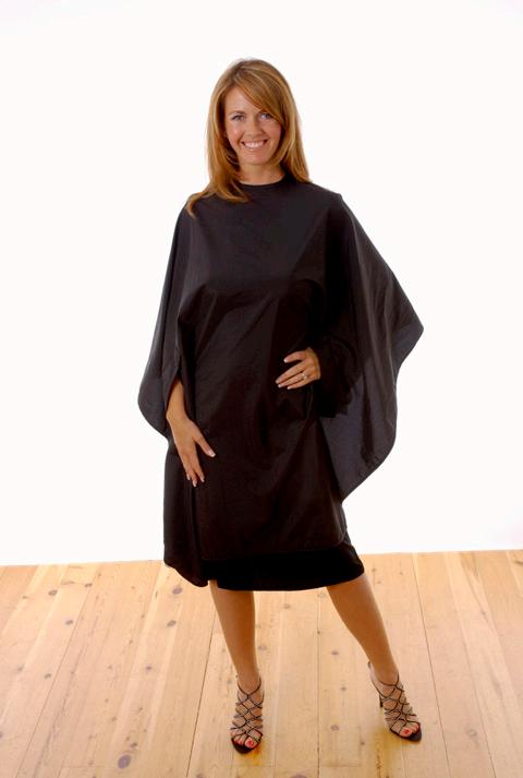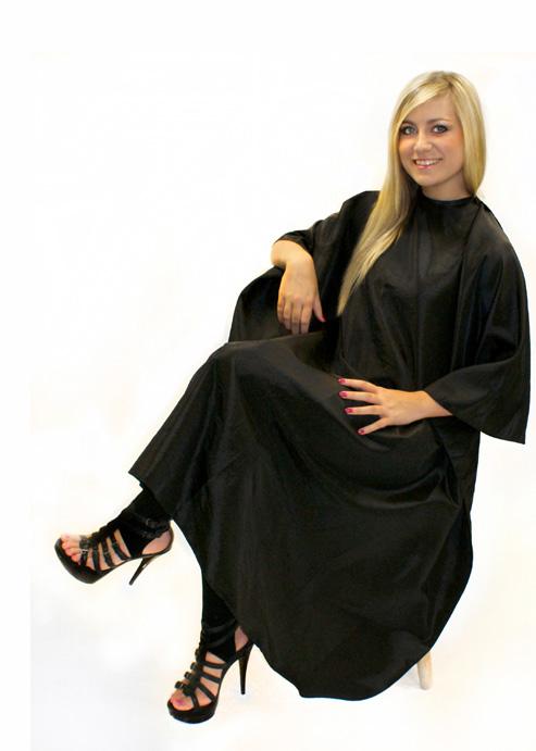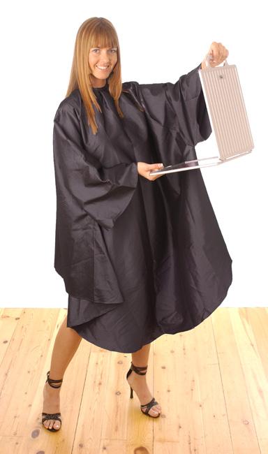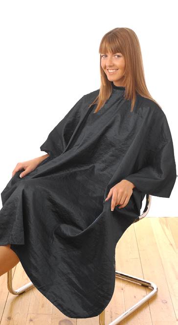 Stylish water repellent cutting gown. Made from a Nylon and Polyester mix. Fastenings that adjust to fit all. Static Free. Black only.