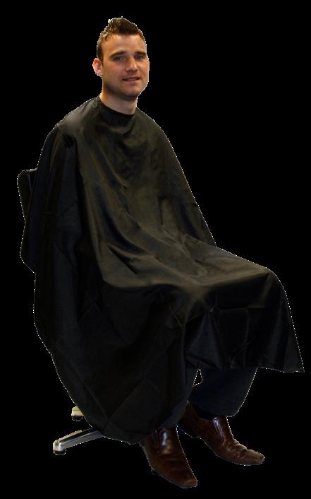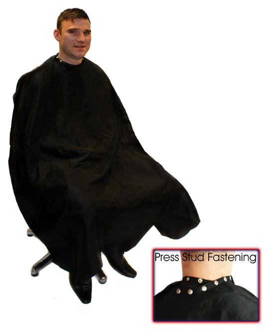A stylish black barber gown, which is water-repellent and static free. Features a press-stud fastening that adjusts to fit all.