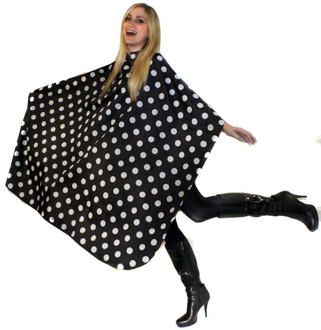Stylish cutting cape, in a polka dot design. 100% polyester. Water repellent. Press-stud fastening that adjusts to fit all. 145cm x 128cm.